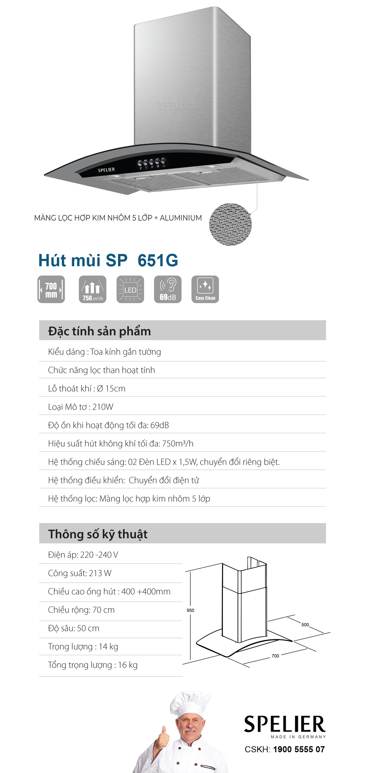 Máy hút mùi Spelier SP 651G có thiết kế dạng kính cong. Kiểu dáng phổ thông nhất hiện nay, với kích thước 70cm. Mẫu máy này gây ấn tượng với người dùng bằng sự cải tiến về thiết kế. Phần kính gắn mặt trước để khi sử dụng dễ lau chùi và sáng bóng. Phím điều khiển bằng nút nhấn dùng bền. Spelier SP 651G trang bị động cơ tuabin đôi có công suất cao đến 213W.
